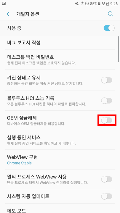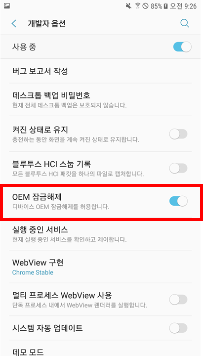 1. 개발자모드 활성화 후 OEM 잠금 해제