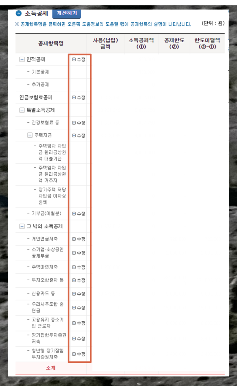 각 항목별로 내가 사용한 금액과 그래서 공제받은 금액, 그리고 한도까지 할 수있습니다.
