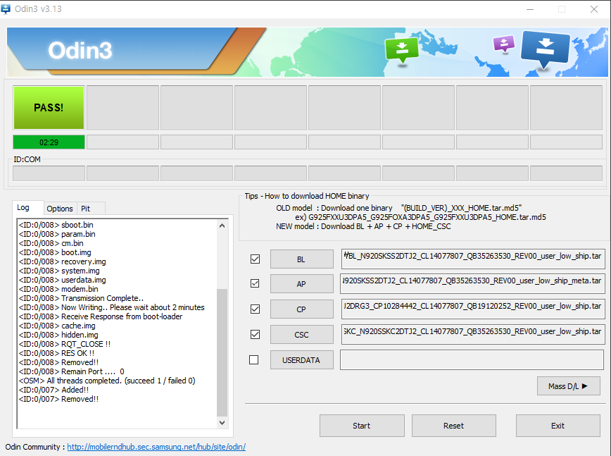 다 끝나고 나면 이렇게 PASS! 가 뜨고 기기는 재부팅됩니다.