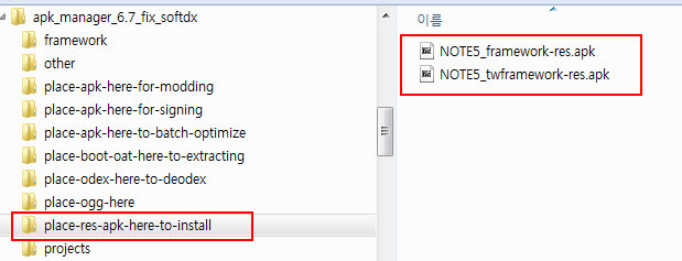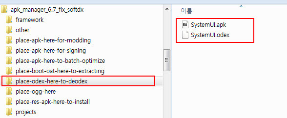 위 화면처럼 2개의 파일을 apk-manager v6.7 의 place-odex-here-to-deodex 폴더로 복사합니다.