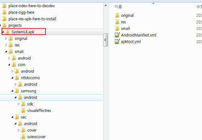 새롭게 생성된 1개의 단일 파일인 SystemUI.apk 파일을 apk-manager 의