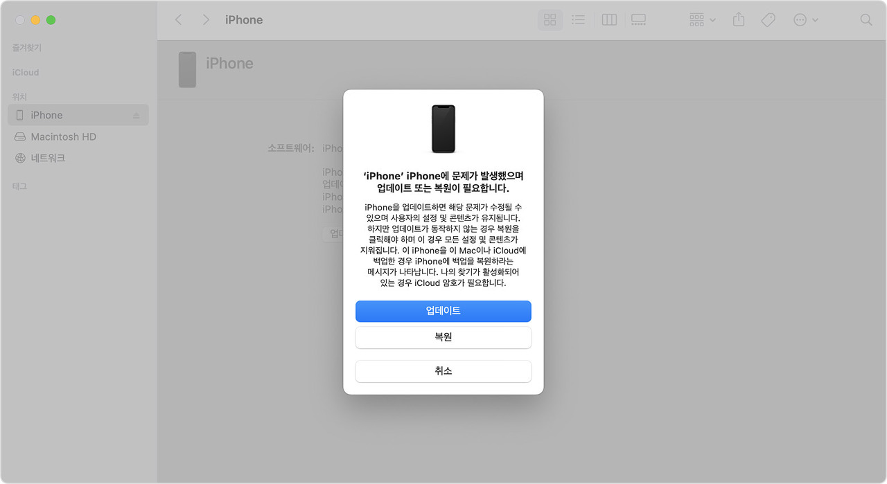 - 컴퓨터에서 기기를 찾습니다. 복원 또는 업데이트 옵션이 표시되면 '업데이트'를 선택합니다. 그러면 컴퓨터가 데이터를 지우지 않고 소프트웨어 재설치를 시도합니다. 컴퓨터가 기기에 소프트웨어를 다운로드하는 동안 기다립니다. 다운로드하는 데 15분 넘게 걸리고 기기에서 복구 모드 화면이 종료되는 경우 다운로드가 완료될 때까지 기다렸다가 3단계를 반복합니다.