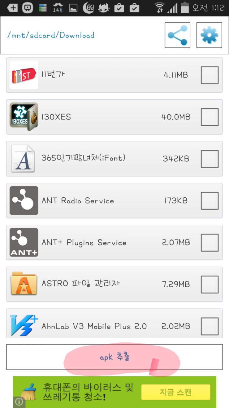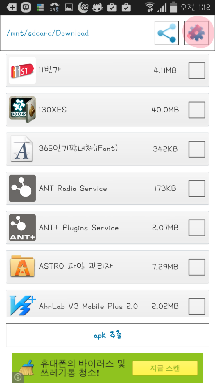 그리고 추출할 어플을 선택한 후 빨간색 표시가 된 곳을 클릭해 주세요.